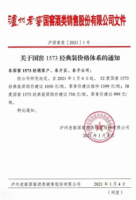 2021年首家宣布调价的白酒企业出现。1月4日,泸州老窖国窖酒类销售股份有限公司发布了《关于国窖1573经典装价格体系的通知》。