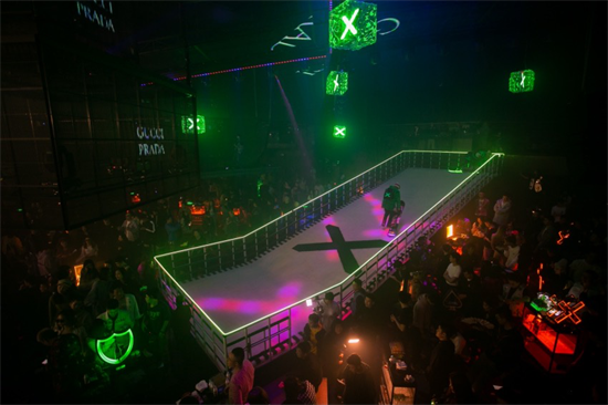 抵达核心区域,ABSOLUT绝对伏特加把真正的滑雪道搬进X-LAND,拆除内场卡座,标着巨大“X”并且长达14米的滑雪道延伸到卡座之间,遍布舞池!现场更邀请到X GAMES全球顶级极限运动员张义威带来极限的滑雪表演。