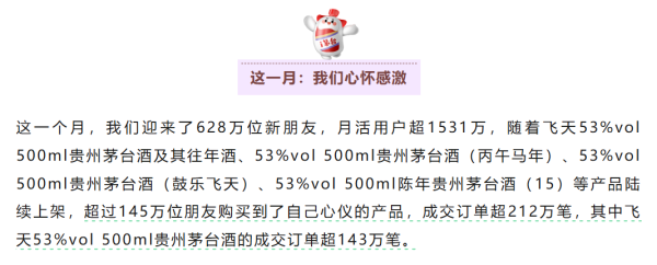 2月2日,茅台官方微信公众号“小茅i茅台”发布题为《i茅台的这一月》的复盘文章,向外界交出了其自今年元旦全面市场化转型、上线核心产品飞天茅台后的首份月度答卷。