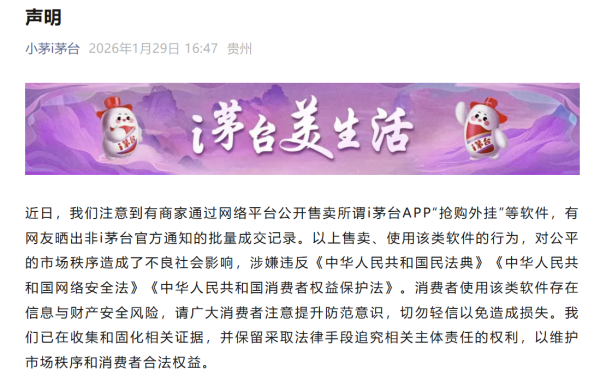 “小茅i茅台”在1月29日发布的一份《声明》中明确表示,近日有商家通过网络平台公开售卖所谓i茅台APP“抢购外挂”等软件,同时有网友晒出非i茅台官方通知的批量成交记录。“我们已在收集和固化相关证据,并保留采取法律手段追究相关主体责任的权利,以维护市场秩序和消费者合法权益。”