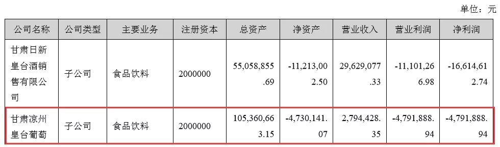 皇台酒业在2010年便成立了甘肃凉州皇台葡萄酒业有限公司(以下简称“凉州皇台”),只是经营状况不大如人愿,据2017年年报显示,凉州皇台的净利润与净资产均为负几百万。
