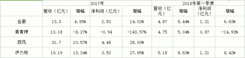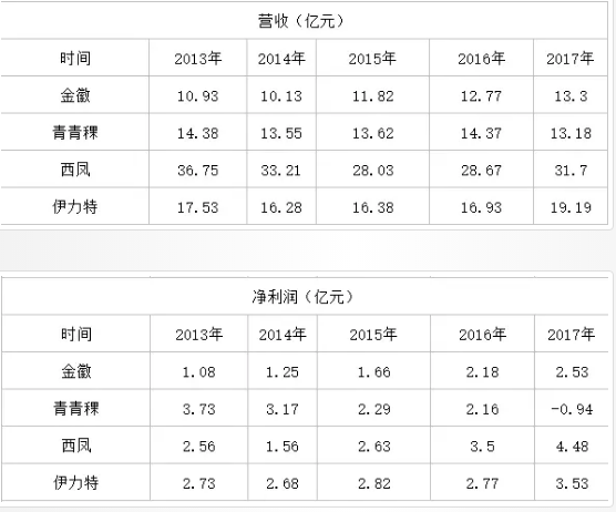 从营收与净利润数值上来看,作为老八大名酒,品牌背书强大的西凤占有优势,而最不容乐观的则是唯一一家在2017年呈现亏损状态的青青稞。