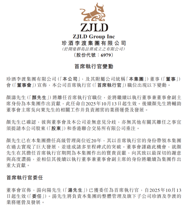 10月13日,珍酒李渡集团发布了一项引发行业关注的高管任命公告:任命汤向阳为集团首席执行官,颜涛则转任集团执行董事兼董事会副主席,两项任命即日生效。