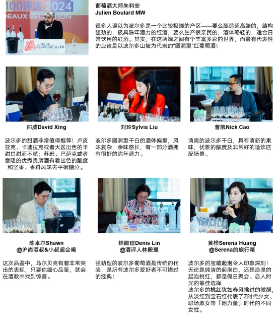 2024“缤纷100评选”历时两天,分初评和复评两轮举行。共有300多款在中国市场上可以买到的波尔多葡萄酒参与角逐。评审团队由葡萄酒大师朱利安Julien Boulard MW带领,加上3位专业评委,著名的葡萄酒讲师和波尔多官方认证讲师邢威、曹凯、刘玲:以及3位在消费者领域具有影响力的KOL评委:金酩奖2023年度葡萄酒KOL,全网拥有50万粉丝的陈卓尔@沪尚酒叔&小叔超会喝、法国最高农业功勋骑士/WSET 4级/酒类作家与讲师林殿理@酒评人林殿理、著名美食美酒旅游生活方式博主,在微博/小红书拥有超过200万粉丝的博主黄桦 @Serena的旅行箱组成。