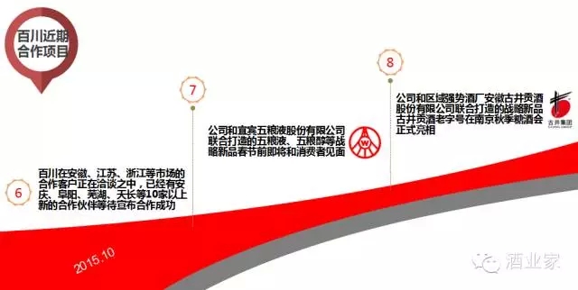 除了年内成立和运行的"上海百茸商贸有限公司"、"昆山百特酒业有限公司"、"百川泰丰"、"百川汇鑫"、百川谷品商贸发展有限公司外,到今年10月份,百川已经有安庆、阜阳、芜湖、天长等10家以上新的合作伙伴等待宣布合作成功。