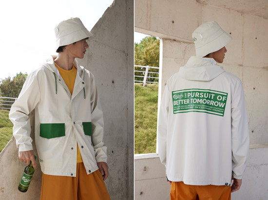 此次嘉士伯与Rains联名款,采用再生环保聚酯材料作为面料。其中,作为轻时尚的流行单品的联名款防水外套,其采用的聚酯纤维回收再利用了约31个塑料瓶,不但质地轻盈,具备雨衣防水性能,更能诠释双方致力为地球减“轻”负担的环保理念,重“塑”未来。