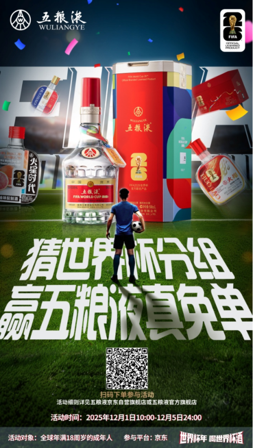 12月1日至12月5日,消费者前往京东五粮液官方旗舰店或五粮液京东自营店购买联名产品,即可参与2026世界杯小组抽签竞猜。凡成功猜中“任意一个分组编号(除东道主组外)及该组前两档球队”的用户,五粮液将全额退还购酒款,真正实现“0元喝好酒”。