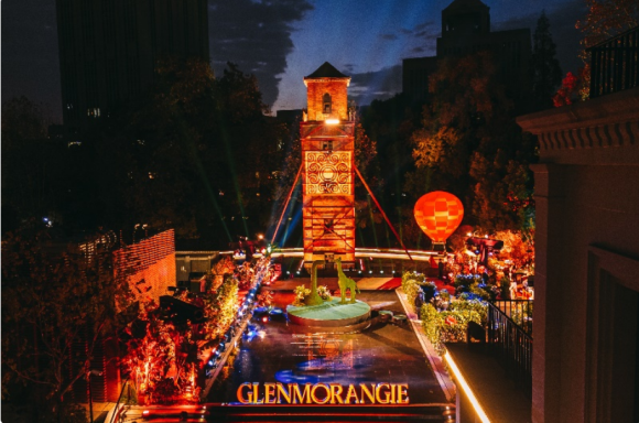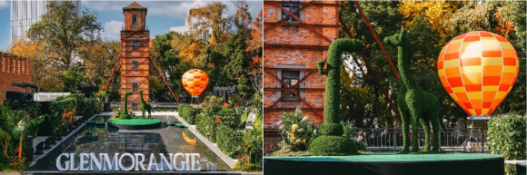 步入格兰杰妙趣新境,巨型“GLENMORANGIE”标识尤为瞩目。远处的水塔上投射着格兰杰古老的印章图标,纵横交错的螺旋纹万花筒图案代表了格兰杰威士忌千变万化的风味与芬芳。水池中央,优雅趣味的长颈鹿植物雕塑,原型源于格兰杰酒厂独特的“长颈鹿蒸馏器”,与奇趣的橙色热气球装置一起,热忱迎接着每位贵宾的到来。