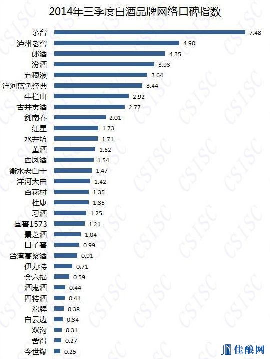 千龙网·中国首都网(千龙网舆情监测分析中心)作为国家统计局中国统计信息服务中心(CSISC)战略合作单位受权发布《2014年三季度中国白酒品牌口碑研究报告》(以下简称《报告》)。《报告》整理了相关线上白酒品牌300多个,筛选出了共计31个比较活跃的白酒品牌作为监测研究对象,从品牌知名度、消费者互动度、质量认可度、企业美誉度、产品好评度及品牌健康度等六个维度对这些品牌进行了公平监测和评价。