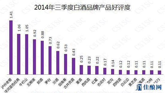 从2014三季度白酒行业网络口碑总体上来看,白酒品牌网络口碑指数较高的品牌以中高档酒为主,茅台再次获得白酒品牌网络口碑的第一名,泸州老窖在本研判期间上升一个名次位列第二,郎酒上升两个名次,位列第三,但两者并没有与其他品牌拉开较大差距;与上研判期相比,榜单前十中,各个白酒品牌口碑指数大小排序互有更迭,整体变化不大,汾酒、沱牌以及舍得滑出榜单前十之列,牛栏山、古井贡酒及红星挤入榜单前十。
