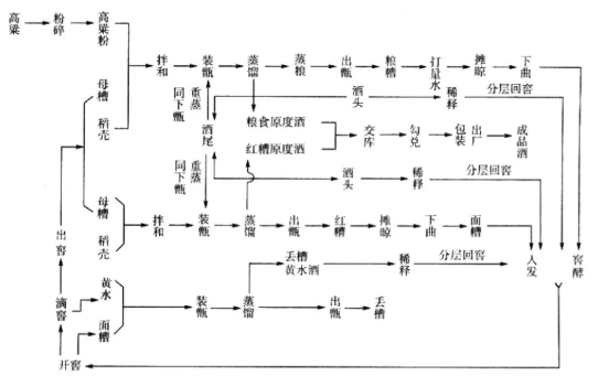 工艺特点为中温大曲,泥窖发酵,续糟(单粮或多粮)配料,混蒸混烧。酒窖有效容积9~24m3,多采用有利于让糟醅接触窖泥的长方形酒窖,多采用有充足窖内酯化时间的60~90天单轮发酵期,整个工艺实施过程始终贯彻执行经典的六分法生产方式(分期发酵、分层起糟、分层投料、分层蒸馏、分段摘酒、分质并坛)。