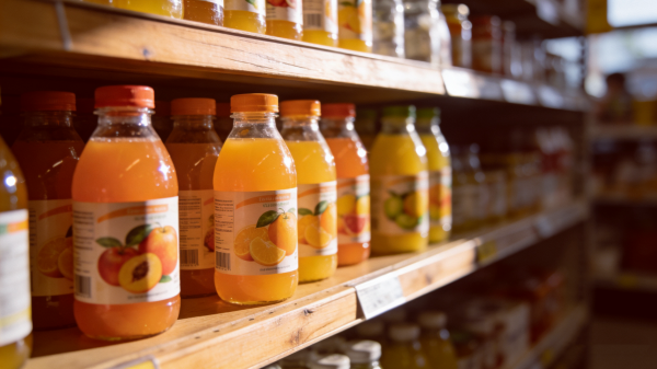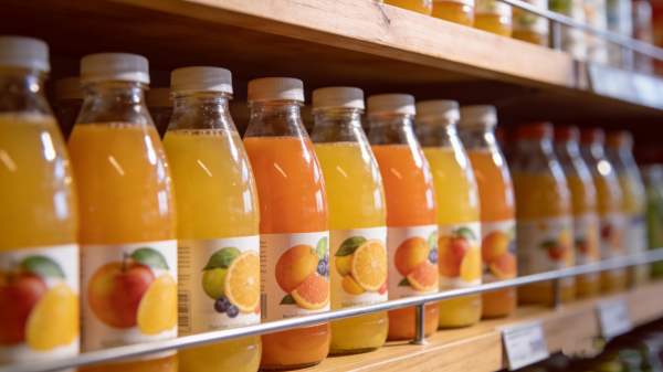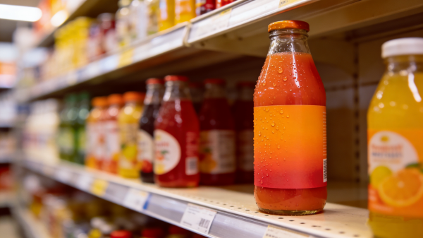 一瓶果汁的正面印着半颗切开的橙子,果汁仿佛要溢出来,让人误以为这瓶里装的都是新鲜榨取的精华。真相可能是:这瓶500ml的饮料里,真正的橙汁含量不到10%,剩下的都是水、糖和香精。还有那些模仿鲜榨果汁的瓶型设计,粗短的瓶身、磨砂质感、甚至故意做得有点"土气",都在暗示你"这是现榨的"。