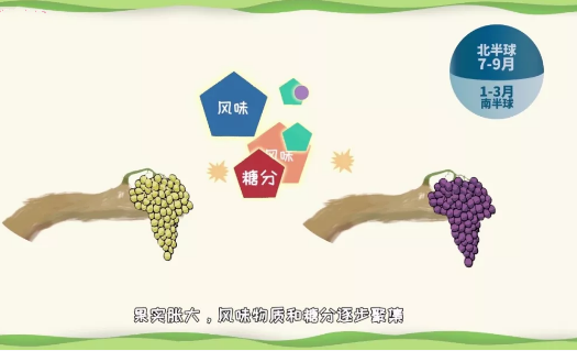 果实长成之后,会逐渐进入转色期,这标志着葡萄开始成熟。在这一阶段,白葡萄会从绿色逐渐向金黄色转变,红葡萄则由绿色逐渐向紫红色转变,果实胀大,风味物质和糖分逐步聚集。在这个阶段,昼夜温差是优质葡萄出产的必要条件,晴好的天气可以保证葡萄完全成熟,凉爽的夜晚则有利于葡萄保持酸度。