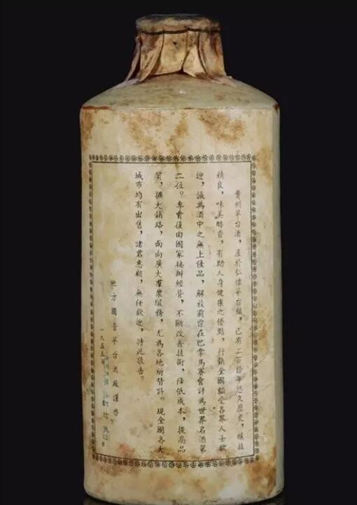 1957年之前的背标样式与内销金轮茅台酒相同,生产日期的标注方式也一样。1957年,外销的茅台酒开始出现了白瓷瓶包装,而且背标内容也发生了巨大变化。