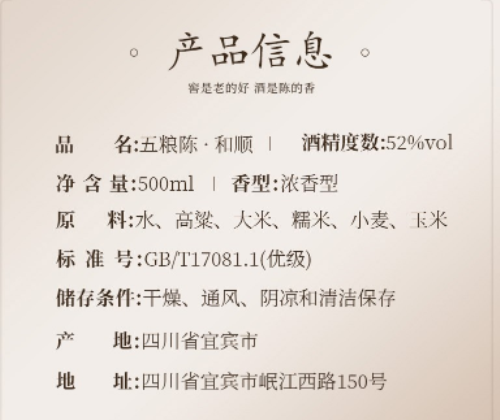 五粮陈·和顺酒体清澈,香气悠久,入口甘美,恰到好处。