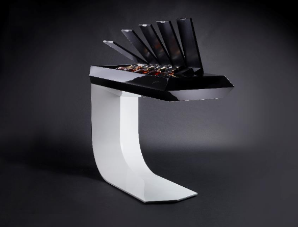 卡慕禧年5.50系列整体采用玫瑰金设计,形似制作珍贵干邑的蒸馏器,黑色周身尽显精致典雅;酒盒将航空和汽车行业使用的钛、铝高精度机械装置相结合,使得干邑的存放更经得起时间的考验;佳酿容器特别选用了被誉为“Héritage Paraison”的Baccarat(巴卡拉)水晶酒樽,球形瓶身更好地凸显了酒液的光泽;而禧年品鉴桌则由300 多个部件组成,是技术实力的集中体现。