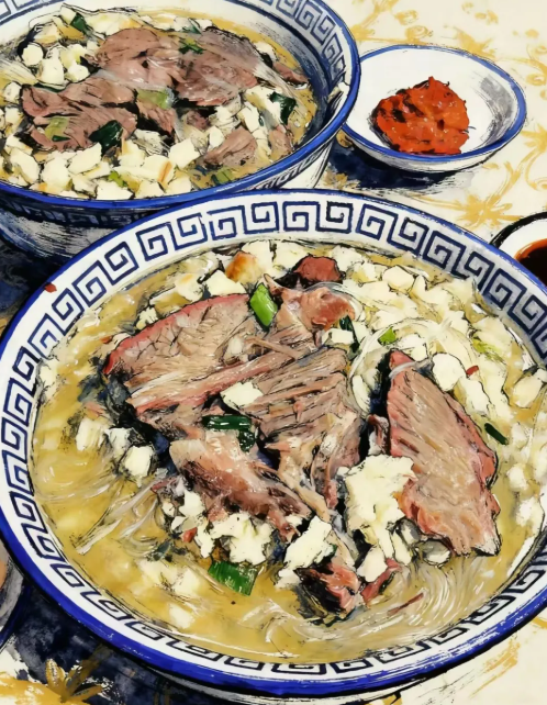 转而向西,踏入西北辽阔的土地,秦腔的高亢嘹亮,正与当地饮食的雄浑厚重相得益彰。一声发自肺腑的“嘹咋咧”!喊得酣畅淋漓,其豪迈的气魄,犹如将掰好的饦饦馍浸入滚沸的羊肉汤中,粗犷的外表下,瞬间吸饱了滚烫鲜美的精华,吃起来是那般直接而痛快。这方言的力度与食物的热辣浓郁交织在一起,在粗粝与淳朴之中,迸发出最为炽热的人间烟火气。