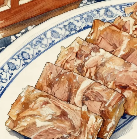 绍兴的压板羊肉更见巧思。取整块羊腿肉,去皮留脂,用苋菜梗卤汁浸透。以青石板相压,置阴凉处凝冻三日。食时切片装盘,透光的肉冻里嵌着细密的花纹,蘸些南乳汁入口,清凉滑腻竟似荤腥里的冷香丸。老食客最喜以此物佐酒,配一碟茴香豆,能在屋檐下消磨整个午后。