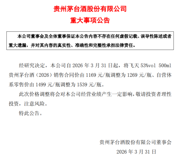 3月30日晚间,贵州茅台酒股份有限公司(以下简称“茅台”)发布重大事项公告。公告显示,自3月31日起,将飞天53%vol 500ml贵州茅台酒(2026)销售合同价由1169元/瓶调整为1269元/瓶、自营体系零售价由1499元/瓶调整为1539 元/瓶。