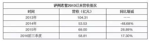 就上表来看,2013年,泸州老窖营业收入104.31亿元;2014年完成53.53亿元,几近腰斩;2015年完成69亿元;2016年度前三季度完成58.81亿元。据近期了解的数据显示,今年泸州老窖的任务完成已达80亿。