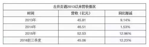 古今贡酒2013年营业收入45.81亿元;2014年完成46.51亿元,涨幅1.53%;2015年完成52.53亿元;2016年度前三季度完成45.06亿元。