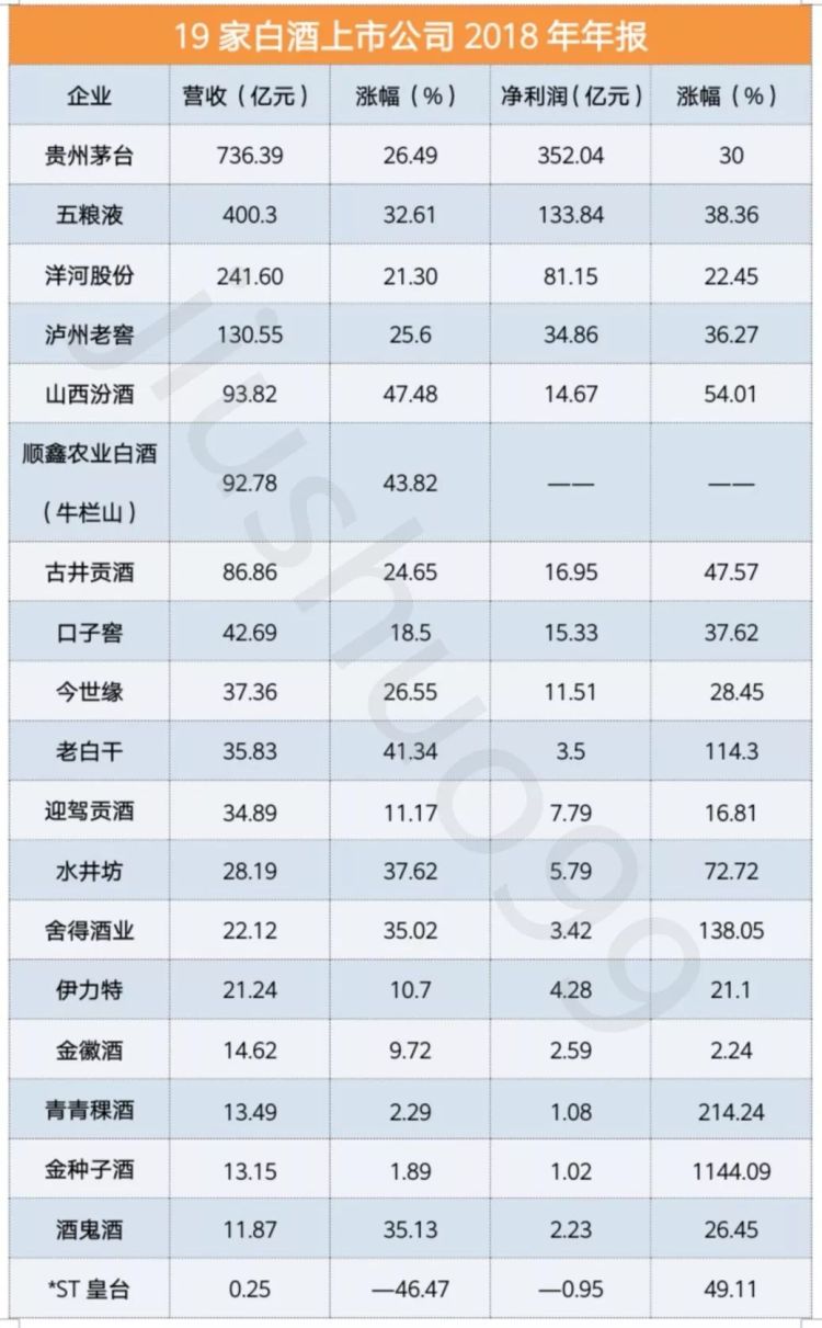 据统计,2018年,19家白酒上市公司共实现营收2058亿元,共实现净利润(除顺鑫农业)691.1亿元,整体营收、净利和其中的15家酒企均实现了双增长,大幅上涨的数据彰显了2018年白酒行业加速增长的真实一面。