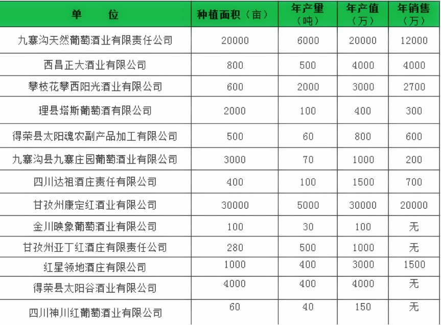 据四川省葡萄酒与果酒协会对16家主要葡萄酒企业所作的统计,截止2018年12月底,四川省酿酒葡萄种植面积大约4.6万亩,年产能1.2万吨。2018年全省葡萄酒产值4.9亿元、年销售额2.8亿元。