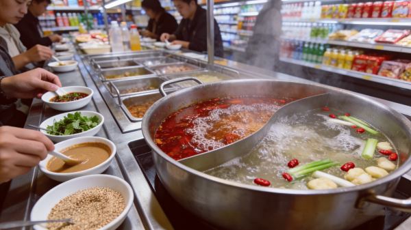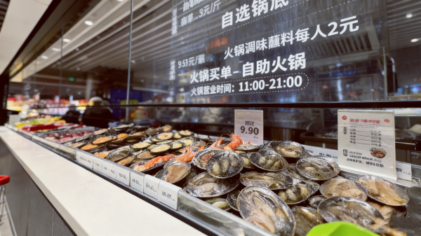 西安曲江新区的盒马鲜生里,傍晚五点刚过,火锅区已座无虚席。一位年轻母亲带着孩子在生鲜区挑选牛肉,转身便坐到了餐桌旁,等待锅底沸腾。