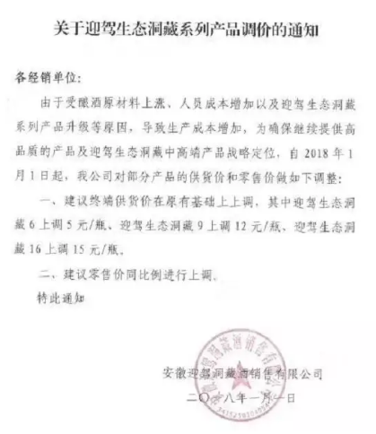 对于提价的原因,洞藏酒公司表示有两点:一是原材料和人员成本的增加以及生态洞藏系列产品升级导致的生产成本提升;二是为确保继续提高产品品质及迎驾生态洞藏中高端产品的定位。