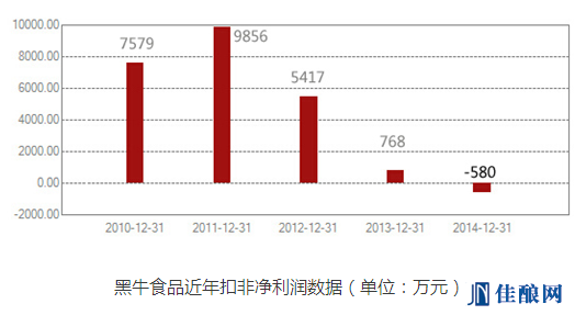 扣非净利润,是指归属于上市公司普通股股东的扣除非经常性损益后的净利润,反映公司主营业务的经营情况。数据显示,自2010年上市后,黑牛食品的扣非净利润从2011年的近一亿元,一路大幅“跳水”,至2014年亏损约580万元,黑牛食品到底怎么了?