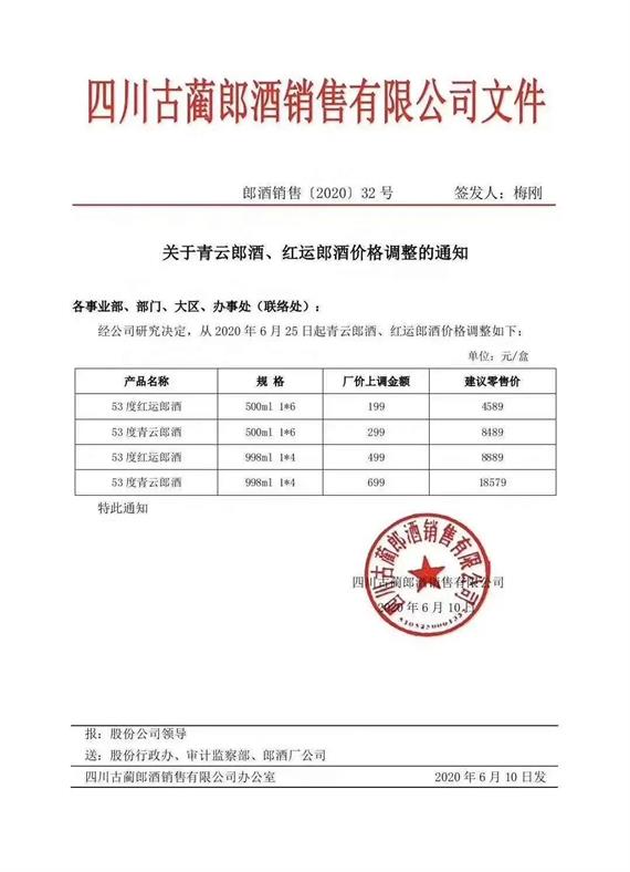 6月10日,酒说记者独家获悉,四川古蔺郎酒销售有限公司最新发布《关于青云郎酒、红运郎酒价格调整的通知》称,自6月25日起,青云郎酒、红运郎酒的厂价和建议零售价进行调整。