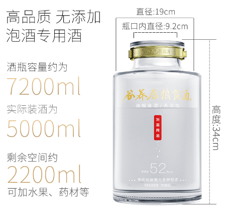 以上问题,谷养康无添加泡酒专用酒都已经替消费者解决,瓶子容量是7200毫升,实际装酒5000毫升,余出2200毫升空间,可直接加入药材和水果,不用在单独买泡酒瓶和白酒;谷养康零添加泡酒专用酒的酒选用的是真正无添加的纯粮食酒,无添加是谷养康粮食酒的品牌理念和定位,无添加的纯粮食酒泡酒才能有效果,口感也更好;瓶子选用的成本更高的无铅环保玻璃瓶,让泡药酒更安全;就连消费者不注意的酒提也是选用304食品级不锈钢,而不是选用成本更低,从外观看着和304无任何区别的201、204不锈钢酒提。可以看出谷养康无添加粮食酒对用户的健康非常负责,每一个细节都从用户的健康角度考虑。