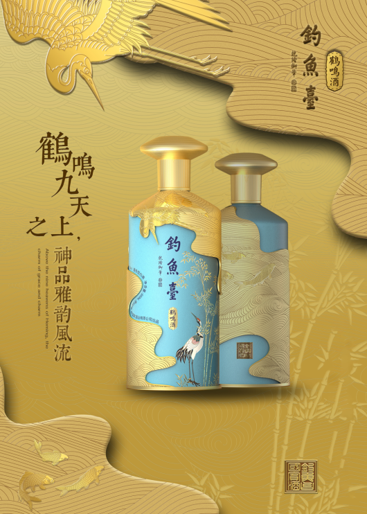 采用黄、蓝两色设计的钓鱼台鹤鸣酒,瓶型美观大气,线条起伏婉转,不仅重点突出“鹤”的美好寓意,而且还蕴藏着水、鲤、竹等吉祥元素。