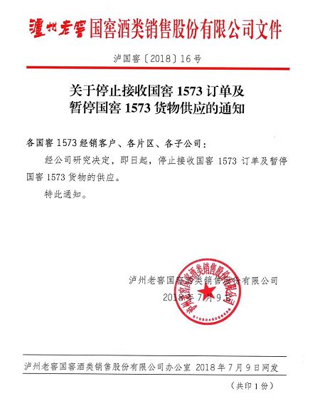 7月9日午间,记者注意到,泸州老窖股份有限公司总经理林锋在微信朋友圈最新发布了一条信息,核心内容为:国窖1573全国停货!
