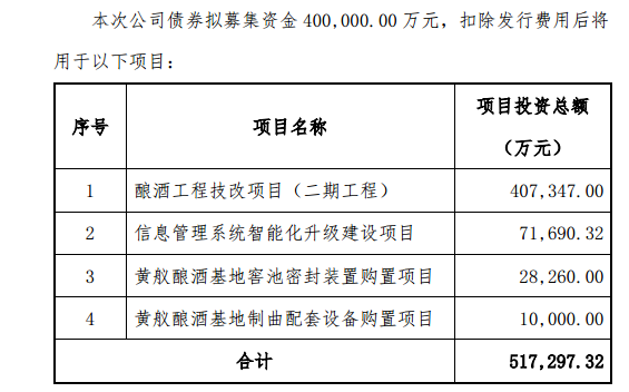 对于本次债券发行的募集资金用途,泸州老窖在此前的公告中曾表示,将用于酿酒工程技改项目(二期工程)、信息管理系统智能化升级建设项目和黄舣酿酒基地装置设备购置项目。
