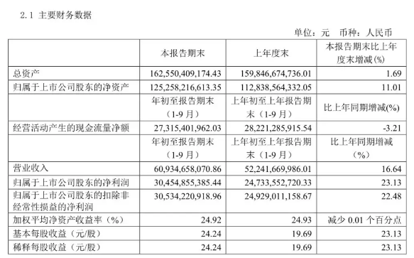 10月15日晚间,贵州茅台发布第三季度公告显示,该公司贵州茅台前三季度净利润达到304.55亿元,同比增长23.13%;营业收入达到609.35亿元,同比增长16.64%。