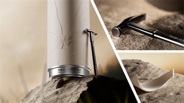 格兰路思51年以颠覆性的“破茧”设计,重新定义威士忌的开启仪式。酒瓶密封于特制环保复合材料Jesmonite(天然矿物粉与水性树脂复合物)制成的圆柱形外包装中,藏家需使用附赠定制工具破除外壳,方能见证杰作真容。这一“破茧”仪式,既是对探索精神的呼应,亦是对“蜕变”的诠释:破碎的外壳并非终结,而是新生的起点。