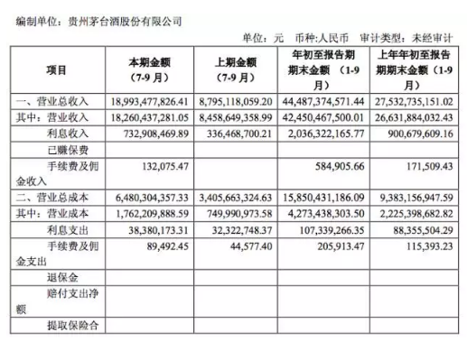 报告显示,茅台前三季度,贵州茅台共营收424.5亿元,同比增长59.40%;净利润199.84亿元,同比增长60.31%。