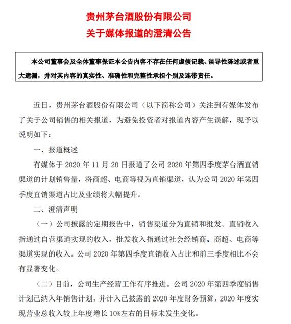 在公告中,茅台指出,有媒体于2020年11月20日报道了公司2020年第四季度茅台酒直销渠道的计划销售量,将商超、电商等视为直销渠道,认为公司2020年第四季度直销渠道占比及业绩将大幅提升。