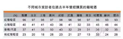 这次调查把葡萄酒分为四大类别:红葡萄酒、白葡萄酒、桃红葡萄酒及香槟/汽酒。当中红酒最为受访者欢迎。过去6个月,整体受访者有96%曾购买红酒,40%则表示曾购买白酒。广州(50%)和成都(43%)的受访者购买香槟/汽酒的比例显著高于整体平均的37%;而这两个城市受访者购买香槟/汽酒的比例较购买白酒的比例高。调查显示,整体受访者购买桃红葡萄酒的比例最低(23%),不过哈尔滨受访者购买桃红葡萄酒的比例(33%)明显高于其他城市。因此,不同城市受访者对葡萄酒的喜好也各有不同。