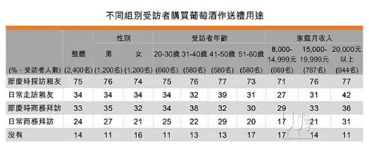 若以受访者年龄区分,年轻受访者以葡萄酒作为送礼用途的比例较年长受访者高。例如20-30岁受访者中有89%表示曾购买葡萄酒作为礼物,而51-60岁受访者中则有83%。另外,家庭月收入越高,购买葡萄酒作为礼物的比例也越高。家庭月收入20,000元以上的受访者中有89%表示有购买葡萄酒作为礼物,而家庭月收入在8,000-14,999元的则有83%。