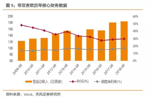 依托并购等内外源增长模式,帝亚吉欧保持了较好的财务业绩。营业总收入由08-09财年的122.83亿英镑推升至17-18财年的184.32亿英镑。期间销售净利率等财务指标始终稳健,并未因并购活动出现短期或长期恶化情况。