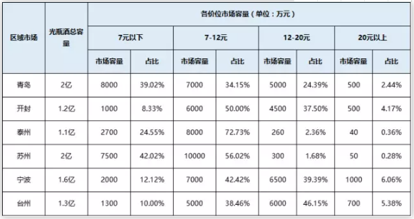★从6个区域市场的综合对比来看,7-12元,以及升级的12-20元区间是目前整个光瓶酒市场上销量最高、占比最多的一个价位段;