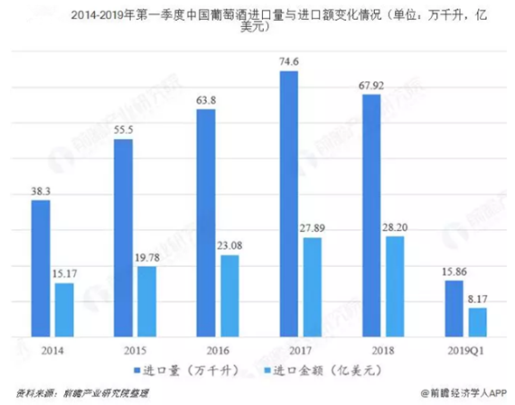 据中商产业研究院发布的数据显示,进口酒进入连续的下行盘整,2018年1~12月葡萄酒进口量为716549千升,同比下降8.95%,这也是近六年进口葡萄酒首次下滑。2019年第一季度,国内累计进口葡萄酒15.86万千升,同比下降24.3%;金额同比下降15.8%。